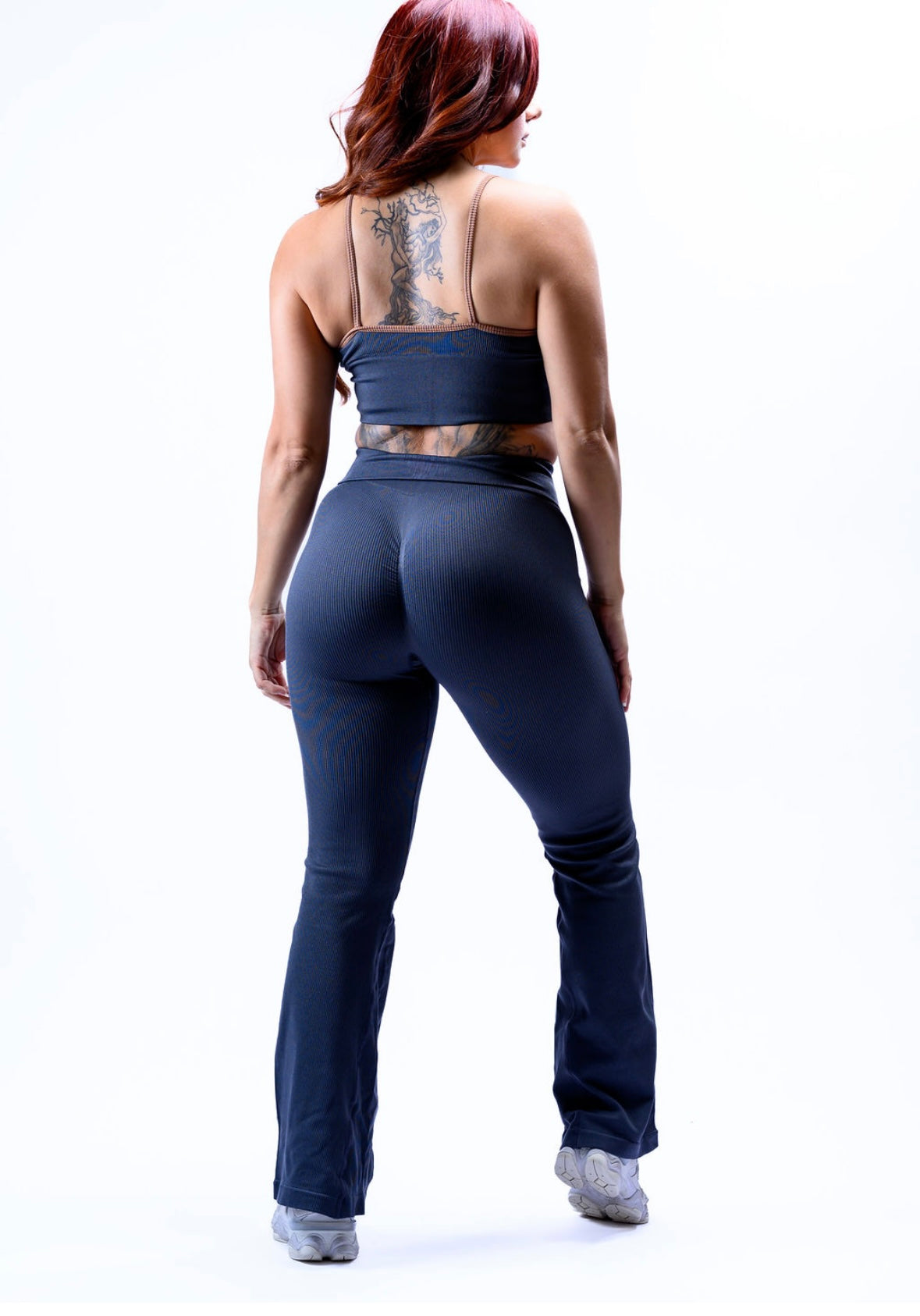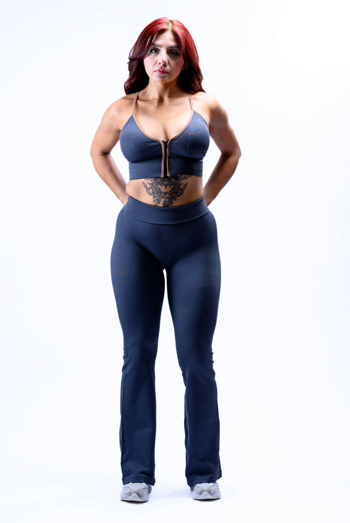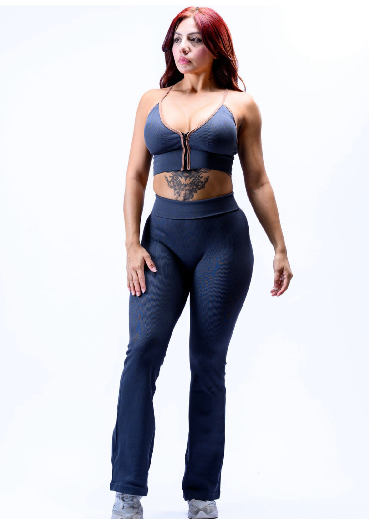Gray Zipper top with additional support hook and brown outer stitch , Flare bell bottom seamless set. Our style with four-way stretch and an innovative, design that lays perfectly on your body for a fit you’ll feel confident in. This material comfortably , sculpts, conceals and flatters your curves through a range of sizes.